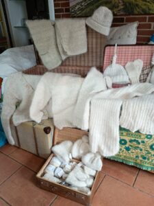 Ich spreche z. B. von mehreren Koffern voll mit wunderschön gestrickten Dingen aus Sammywolle. Schals, Jacken, Stirnbänder, Mützen, Babysachen, Handschuhe usw. usw., alles was das Herz begehrt 😊