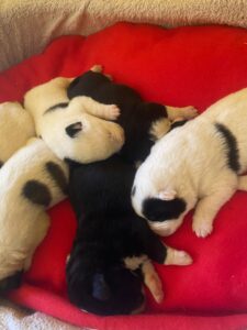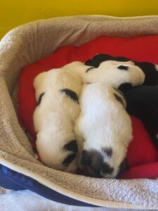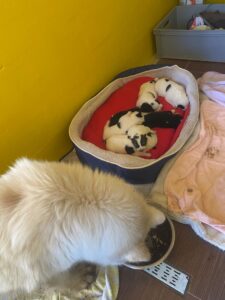 Übrigens war ihre menschliche Geburtsbegleitung so aufgeregt, dass sie sich kurzerhand verzählt hat – kann ja mal passieren. Es sind nämlich „nur“ sieben Stück: fünf weiß gefleckte und zwei schwarze mit ein bisschen Weiß.