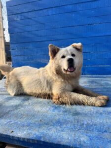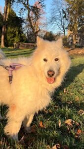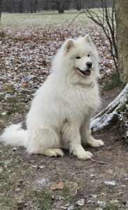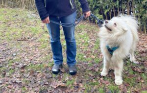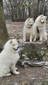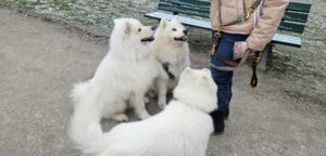 Auf diesem Bild sitz er in der Mitte. Auf Kommando geht er an der Leine einen Schritt hinter seiner Halterin, was bei einem Samojeden Seltenheitswert hat, denn normalerweise tun sie so einen Wunsch mit einem: wieso sollte ich das tun? Achselzucken ab…. Bei seiner Vermittlung entscheiden wir nicht alleine wohin er geht, sondern soll auch seine Bezugsperson ein gutes Gefühl haben, da Timmy schweren Herzens abgegeben wird.