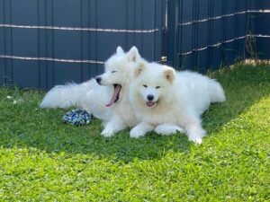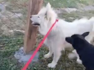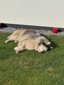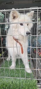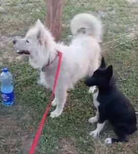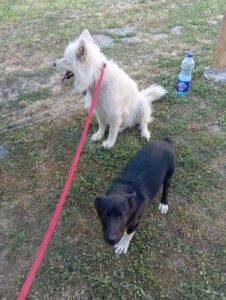 Die Halter der Sammyhündin sind ausgewandert. Zwischenzeitlich ging offenbar auch der Samojede mal auf Wanderschaft, denn irgendwo muss sie einen schwarzen Galan kennen- und sozusagen auch „lieben“ gelernt haben. Jedenfalls hatte sie bei der Auswanderung der Leute zwei schwarze Welpen. Einen davon übernahm ein Nachbar und den übrigen Welpen, mit der Mama, letztendlich wir. Die junge Hündin ist bester Dinge, neugierig und aktiv, womit sie ein anstrengender Job für ihre Mutter ist. Wir hoffen von Herzen Menschen zu finden, die die Arbeit gerne übernehmen und sich in das Abenteuer „Junghundpower, Erziehung und Beschäftigung“ begeben möchten. Außerdem natürlich einen guten Platz für unsere Sammyhündin.