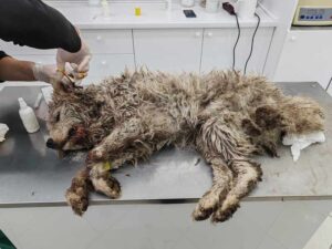 Dieses Foto wurde im Dezember 23 aufgenommen, nachdem sie gefunden und direkt in die Tierklinik gebracht worden war. Wir fiebern ja mit allen Hunden mit, aber sie gehörte zu denen, die uns in unsere Träume folgten. Ihren heftigen Verletzungen nach zu urteilen, war sie einem Wildschwein zum Opfer gefallen. Aber Nadija nahm unser Angebot an, um ihr Leben zu kämpfen und siegte! Jetzt zeige ich euch ein recht aktuelles Video von ihr.