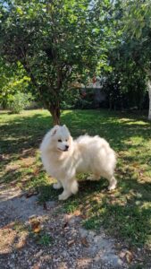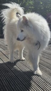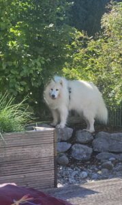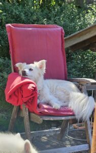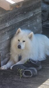 Bijeli (früher Bonibon, Ende 2020 adoptiert)), von Karin und ihrem Mann, machte lieber den Schuhen den Schattenplatz streitig,