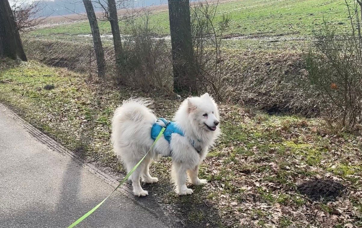 Tobi läuft super an der Leine. Nur wenn es losgeht und er aufgeregt ist, zieht er, was sich aber sehr schnell legt. Auch „spricht“ er, wenn er aufgeregt ist. Da kann es schon mal ein mehrseitiger Kurz-Roman in Hundesprache werden, bis er fertig ist. 🤣